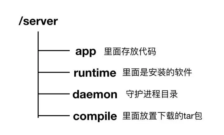如此进行server文件夹的目录设置,将服务所需软件与机器的通用软件进行了分离,不仅便于云主机的日常维护,同时当需要整个删除服务的时候,直接删除server文件夹即可简单清除。