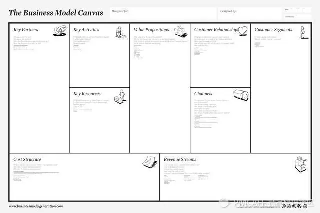 感谢当年在大学的 SIYB 课程,我发现了一个工具—— Alex Osterwalder 「商业模式画布」,仅用一张纸就可以将商业模式的基础知识记录下来,很容易分享,也更容易阅读。同时因为只有一页,没有太多的空间,所以需要将想法精简到最基本的构建模块(没地方说废话……)。但是正如名称一样,它过分关注于商业模式和业务,对于产品经理应该去关注的其它方面关注度不够(比如用户和客户)。