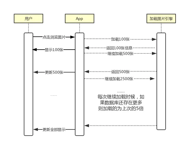 加载图片路径时候的工作,一般都是在线程(或者异步任务)做的,上图用虚线表示异步,加载好了再通过消息刷新到UI去显示。先加载100张图片信息,通过消息把这部分数据扔给UI 去刷新显示;如果还有更多,接着继续加载100 * 5 张图片,再通过消息把这部分数据扔给UI显示;如果还有更多,接着再加载100 * 5 * 5 张……一直都没有更多为止。这样用户就不用怎么等待,感觉图片就一下子加载出来了。