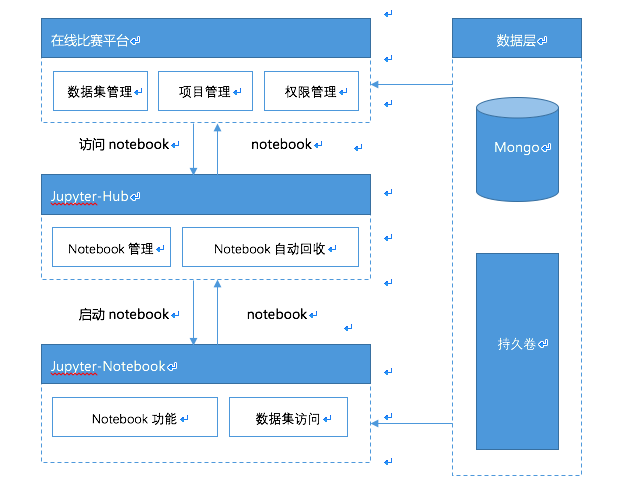 在demo中我使用的是kubespawner, 所以这里的持久卷是k8s的持久化卷,用来管理用户数据集和上传和访问。jupyter-hub在管理notebook的同时,也作为代理服务,可以直接把jupyter-notebook的内容返回给在线比赛平台。