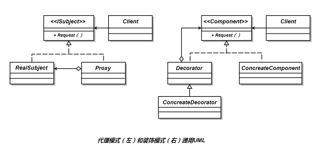 从上图可以看到,代理模式和装饰模式的类图非常类似,装饰模式可以说是代理模式的一个特殊应用,两者的共同点是都具有相同的接口。