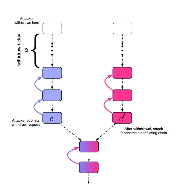 远程攻击来源于用户不得不撤回保证金的权利。这就产生了一个基本问题,因为这意味着攻击者可以从任意长度的距离建立一个分杈而不用担心被削减。一旦保证金被解除绑定,激励不从某个高度区块前进行长距离投票就被取消了。换句话说,当超过2/3的验证者解除了绑定,那么他们就可以恶意的创造包含之前验证者集的第二条链,这可能导致任意的交易。