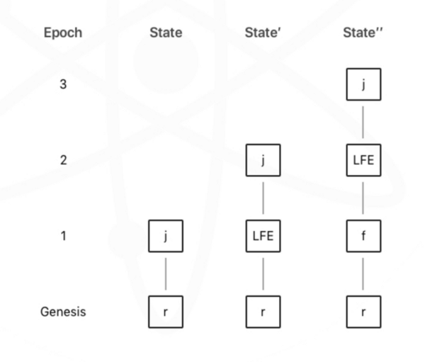 在一个周期前最终化检查点需要2个周期才能完成,也就是需要两轮投票。例如,当超过2/3的验证者(也就是大多数)给一个检查点c投票了,那么就说这个检查点已经被”审判”了。下一个周期,当大多数人给检查点c投票了,会发生两件事情:c变成了被审判的并且c已经最终化了。c这个周期也就代表着最后一个最终化的周期(LFE)。
