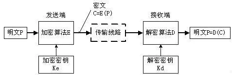 发送端将明文P 通过加密算法E与加密密钥Ke,生成密文C,然后传输到接收端,接收端收到密文后通过解密算法D与解密密钥Kd对密文C进行解密,最终还原明文P。