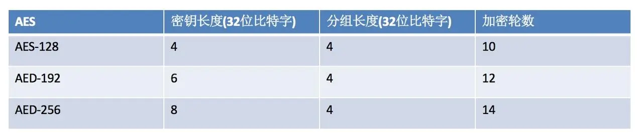 AES为分组密码,分组密码也就是把明文分成一组一组的,每组长度相等,每次加密一组数据,直到加密完整个明文。在AES标准规范中,分组长度只能是128位,也就是说,每个分组为16个字节(每个字节8位)。密钥的长度可以使用128位、192位或256位。密钥的长度不同,推荐加密轮数也不同。
