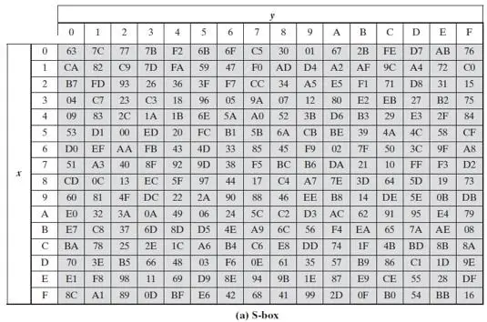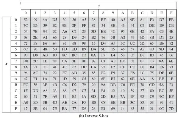 假设: 字节00000000B能过加密替换表x=0,y=0替换后的值为(S[0][0]=)63H,再通过解密替换表即可得到替换前的值x=6,y=3,(S-1 [6][3]=)00H。