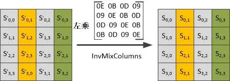 逆向行移位: 逆向行移位即是相反的操作,即:第一行保持不变,第二行循环右移8比特,第三行循环右移16比特,第四行循环右移24比特。