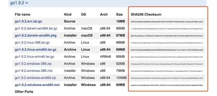 我们从很多下载文件的网站都会看到一些 SHA256, MD5 码,这就是对文件进行校验的,验证文件是不是官方发页的,有没有被窜改过。我们看golang.org官方源码包:
