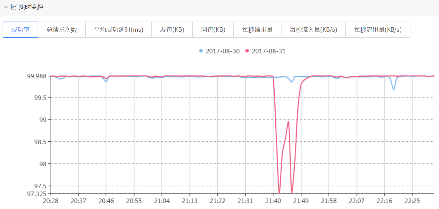 2017年8月31日 21:40~21:50 X业务模块指标异常,成功率由99.988%降为97.325%。如下图所示: