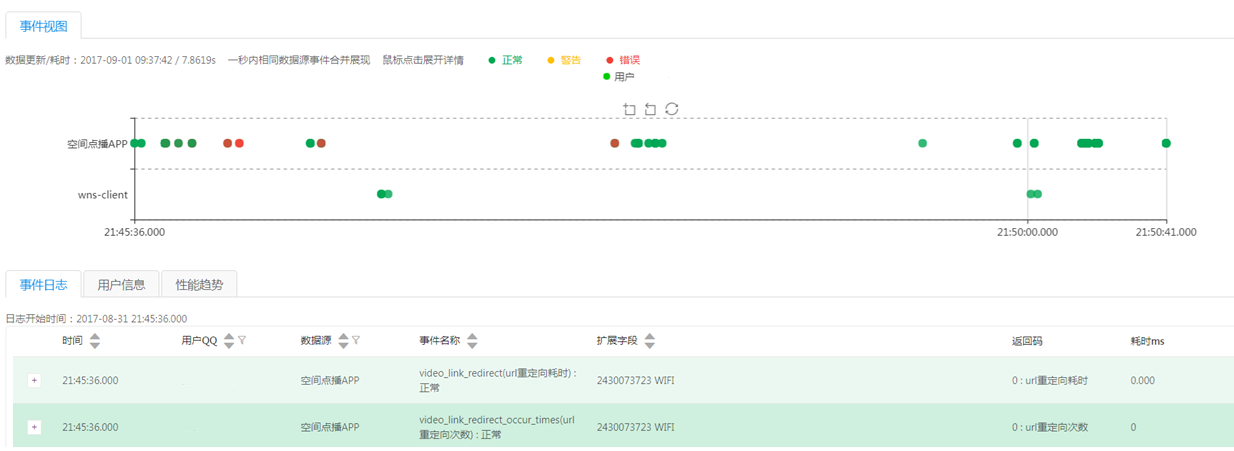 通过大盘多维数据分析发现异常原因后,因涉及APP问题,还需要进一步分析用户出现异常的上下文。因而需要查看出现异常的用户在异常时间点的全链路日志数据。在全链路视图上,可以展示查询出来符合异常条件的用户日志和操作过程。