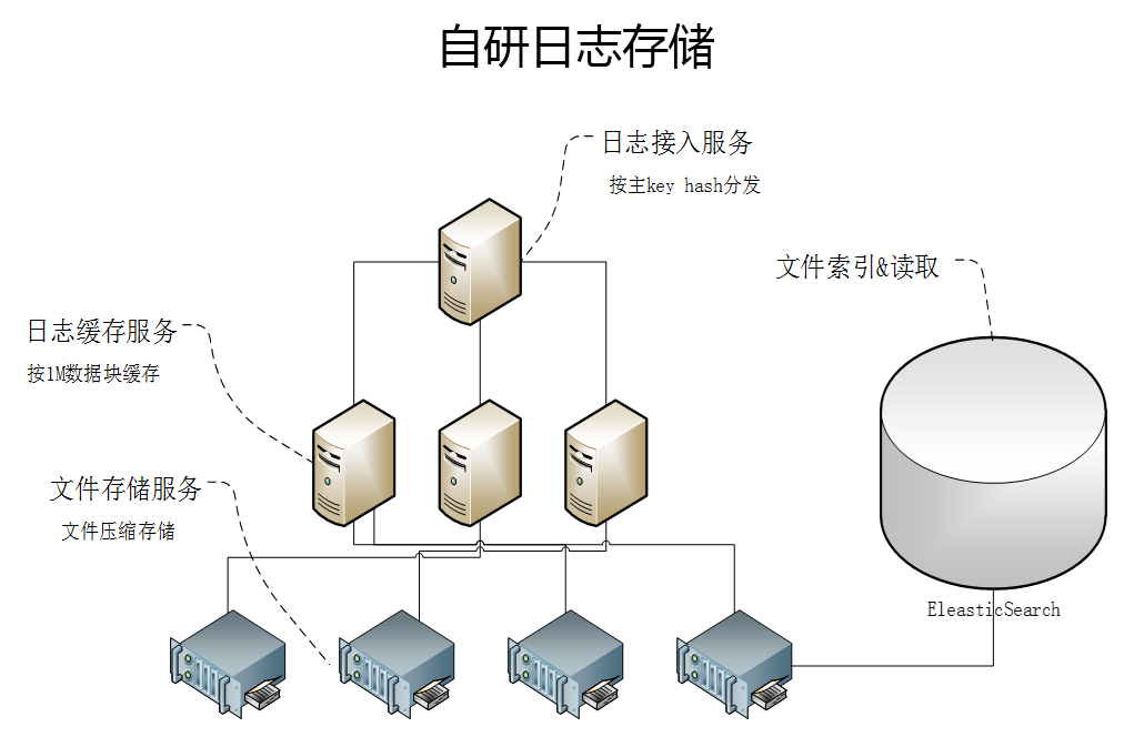 日志的存储方案为应对高效和低成本查询,我们采用自研的方式实现。全链路上报的数据按用户ID或请求ID作为主key进行hash分片。分片后的数据在缓存模块累积1min或1M大小,然后写入文件服务器集群。文件写入集群后,将hash值与文件路径的映射关系写入ElasticSearch。
