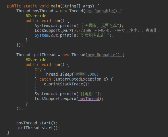 上图中可以看到,boyThread通过park阻塞线程,直至girlThread调用unpark唤醒。