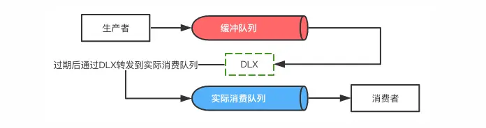 延迟消费是延迟队列最为常用的使用模式。如下图所示,生产者产生的消息首先会进入缓冲队列(图中红色队列)。通过RabbitMQ提供的TTL扩展,这些消息会被设置过期时间,也就是延迟消费的时间。等消息过期之后,这些消息会通过配置好的DLX转发到实际消费队列(图中蓝色队列),以此达到延迟消费的效果。