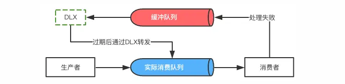 如下图所示,消费者发现该消息处理出现了异常,比如是因为网络波动引起的异常。那么如果不等待一段时间,直接就重试的话,很可能会导致在这期间内一直无法成功,造成一定的资源浪费。那么我们可以将其先放在缓冲队列中(图中红色队列),等消息经过一段的延迟时间后再次进入实际消费队列中(图中蓝色队列),此时由于已经过了“较长”的时间了,异常的一些波动通常已经恢复,这些消息可以被正常地消费。