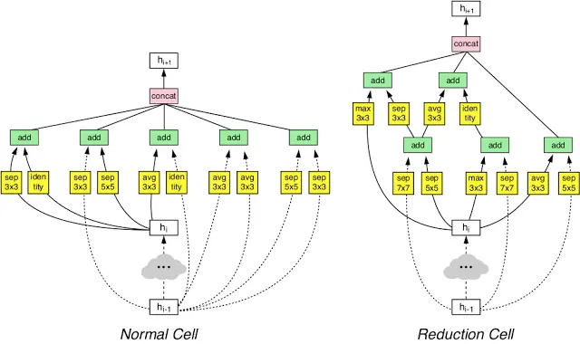 | 我们的 NASNet 架构由两种类型的层组成:正常层(左)和还原层(右)。这两种层都由 AutoML 设计。 |