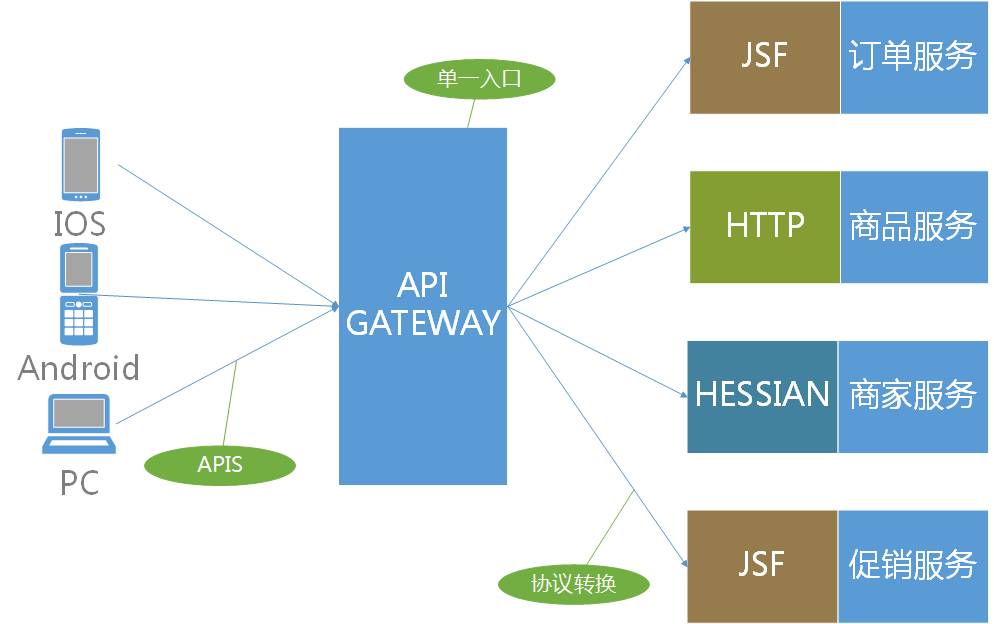 这里说的网关是指API网关,直面意思是将所有API调用统一接入到API网关层,有网关层统一接入和输出。一个网关的基本功能有:统一接入、安全防护、协议适配、流量管控、长短链接支持、容错能力。有了网关之后,各个API服务提供团队可以专注于自己的的业务逻辑处理,而API网关更专注于安全、流量、路由等问题。