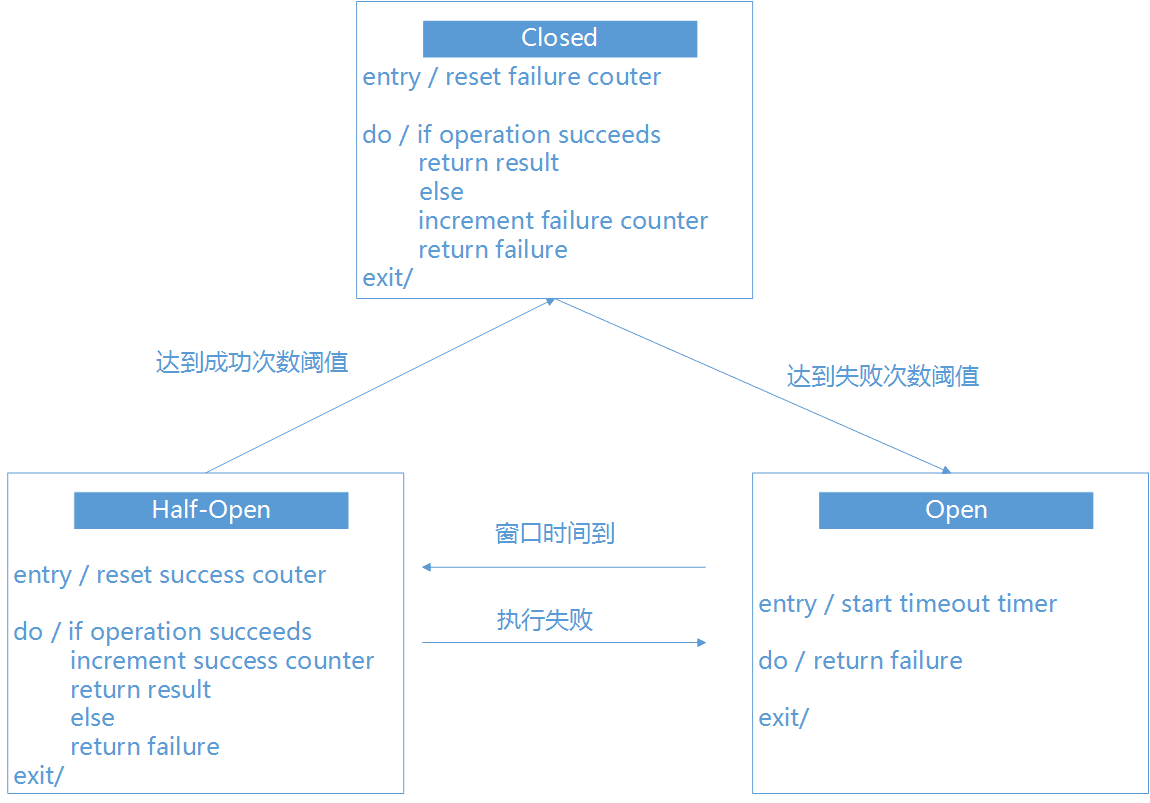 熔断技术可以说是一种“智能化的容错”,当调用满足失败次数,失败比例就会触发熔断器打开,有程序自动切断当前的RPC调用,来防止错误进一步扩大。实现一个熔断器主要是考虑三种模式,关闭,打开,半开。各个状态的转换如下图。