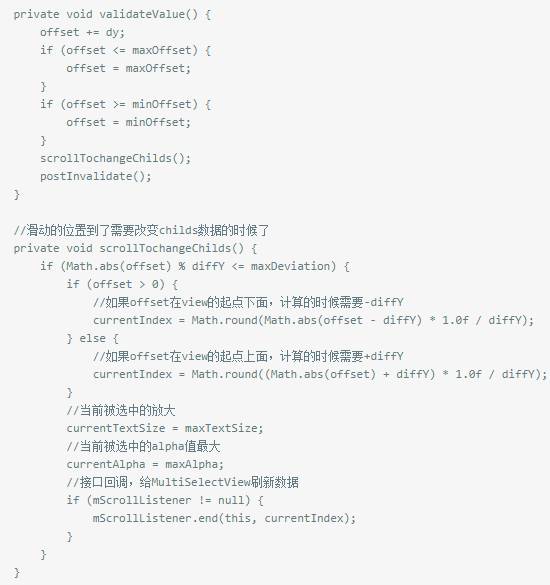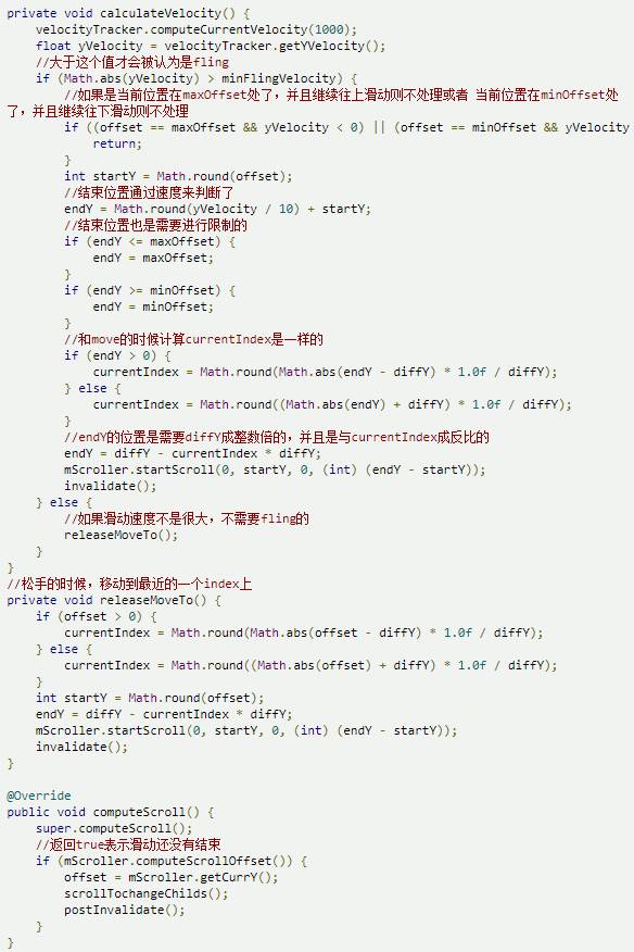 相信看图能知道是怎么回事了吧,临界值就是这么来的。上面的move操作里面还进行了一个currentIndex的处理,当认为Math.abs(offset) % diffY <= maxDeviation的时候,则需要重新获取新的被选中的index了。