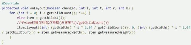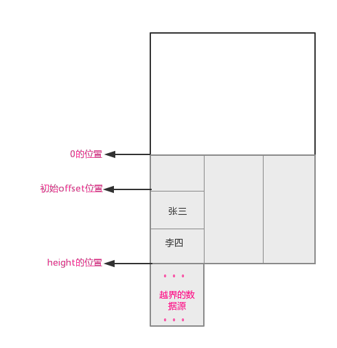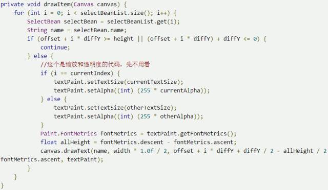 知道了这两个变量后,咋们再来看下绘制内容的代码,首先在遍历数据源的时候,有越界的判断,分别是有四种情况是在绘制区域外的:offset + i * diffY > height:item的上边缘在height之下 (offset + i * diffY) + diffY < 0:item的下边缘在0之上(offset + i * diffY == height):item的上边缘在height位置 (offset + i * diffY) + diffY == 0:item的下边缘在0这个位置