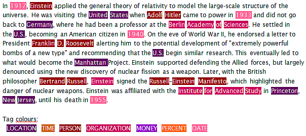 会返回类似这样的内容:Ram of Apple ORG Inc. ORG travelled to Sydney GPE on 5th DATE October DATE 2017 DATE.