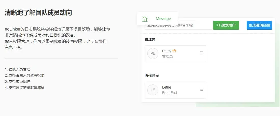 9、强大的团队协作功能,你可以通过 URL 快速邀请成员或者加入某个项目,eoLinker 提供了全面的日志追踪以及权限管理功能。