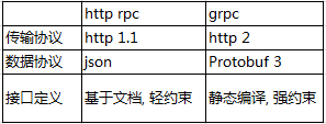 传统的微服务通常基于http协议来进行模块间的调用,而在我们的微服务构建中,选用了Google推出的gRPC框架来进行调用。下面这张简表比较了http rpc框架与gRPC的特性: