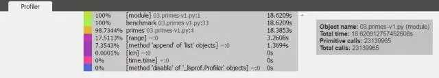 就像在使用 memory_profiler 时一样,你需要在你想分析的函数上加上一个装饰。在我们的例子中,你需要在 03.primes-v1.py 中的 primes 函数的定义前加上 @profile。然后像这样调用: