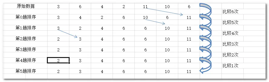 遍历数组,进行n - 1趟排序,并在每趟排序中比较相邻两个元素,若满足条件则交换数据。而第i趟排序会将在n-i个元素中的最大值交换至n-i-1的位置