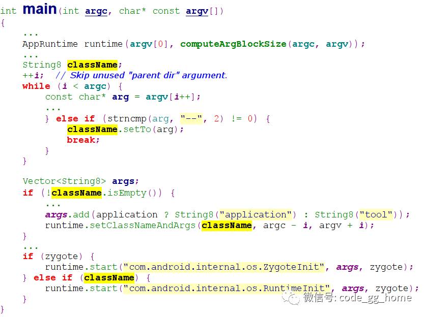 new 一个 runtime 实例,将参数设置进来。这里参数是shell脚本里面带来的,即/system/bin 和 com.android.commands.am.Am,以及我们代入的其他参数( 比如:am start -n com.android.camera/com.android.camera.Camera 这里的start -n com.android.camera/com.android.camera.Camera 也会作为参数带入 )当找到 className 的时候,就会跳出循环,不解析后面的参数,然后将 className 以及后面的参数,通过runtime.setClassNameAndArgs设置到 runtime 里面,然后启动 runtime.start("com.android.internal.os.RuntimeInit", args, zygote);