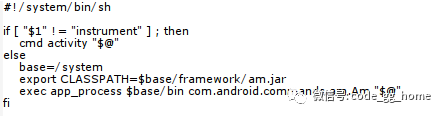 我们直接看else的这部分, base=/system export CLASSPATH=$base/framework/am.jar exec app_process $base/bin com.android.commands.am.Am "$@" 这里可以看到就是几条 shell 命令,第一行定义一个变量,第二行导出一个类的搜索路径第三行使用exec创建一个app_process进程,然后找到里面的com.android.commands.am.Am类,调用里面的main方法