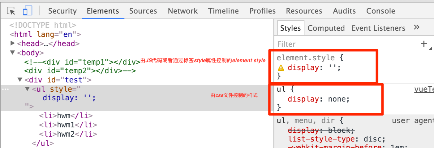 如下图所示,value=true时,v-show改变的是element.style,由于无效,显示效果由css文件中的display决定。