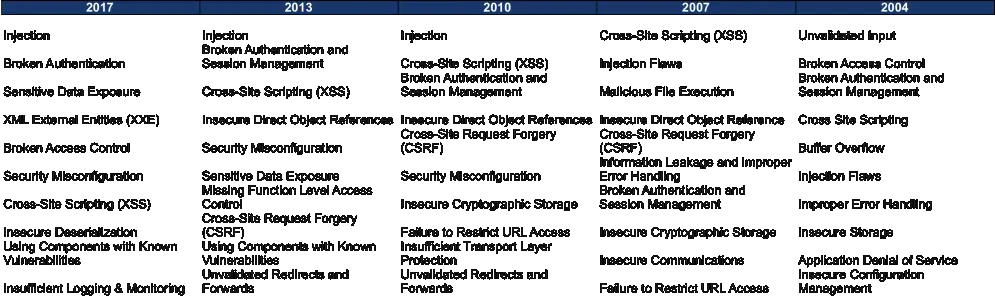 OWASP多年来经历了几次迭代。 OWASP Top 10的版本分别在2004年,2007年,2010年,2013年和2017年发布。