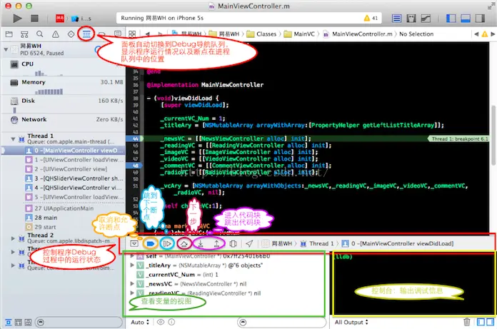 LLDB 是一个有着 REPL 的特性和 C++ ,Python 插件的开源调试器。LLDB 绑定在 Xcode 内部,存在于主窗口底部的控制台中。调试器允许你在程序运行的特定时暂停它,你可以查看变量的值,执行自定的指令,并且按照你所认为合适的步骤来操作程序的进展。