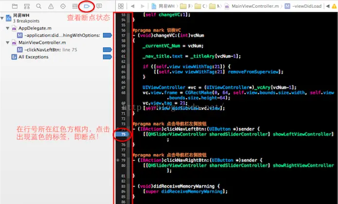 蓝色对勾:蓝色对勾后面表示,当前断点所处的位置。 将对勾抹去,表示该断点失效。(代码行数显示你可以在菜单栏Xcode->Preferences ->TestEditing->勾选 Line Numbers,将代码行数字显示出来。)