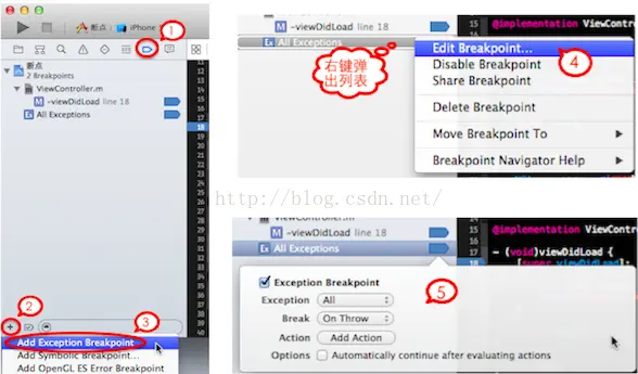 Exception:选项可以让你选择响应Objective-C对象抛出的异常,也可以选择响应C++对象抛出的异常。
