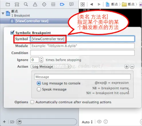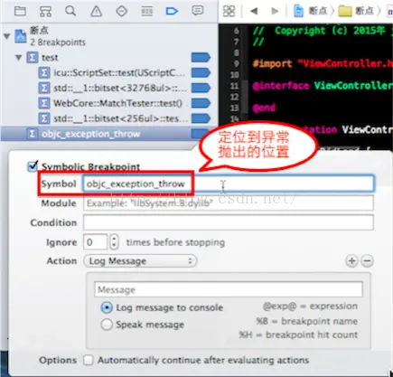 符号断点可以中断指定函数的调用,也可以定位到出现异常的代码处,并打印异常信息。