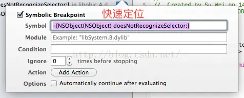 在Symbolic中填写如下方法签名 -[NSObject(NSObject) doesNotRecognizeSelector:]
