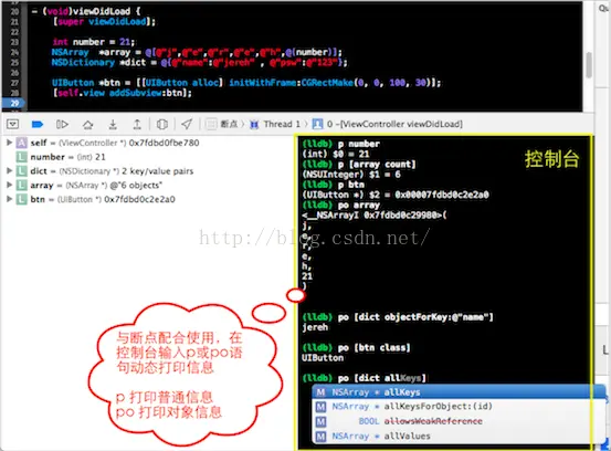 在程序的调试过程中,除了通过断点调试在Xcode下方查看变量的值,也可以通过NSLog在控制台输出想要的信息。使用NSLog输出需要在运行前就把想要输出的信息写好,如果有改变,需要重新编译运行,效率非常低。