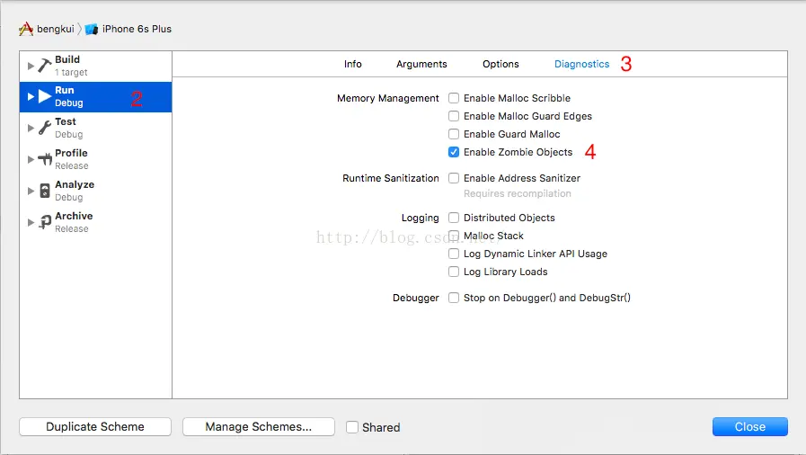 在左侧选中Run ,在上方打开 Diagnostics选项。要启用僵尸对象,勾选 Enable Zombie Objects选框。