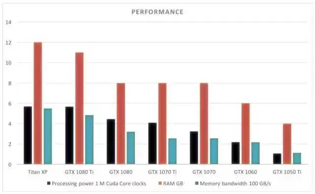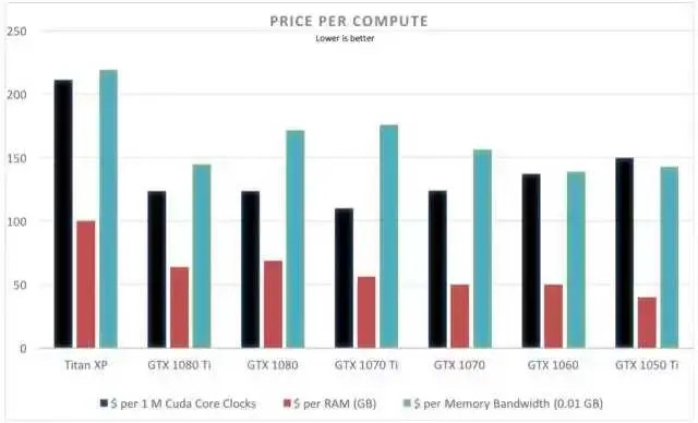 价格对比表明 GTX 1080 Ti、GTX 1070 和 GTX 1060 的性价比较高。所有GPU都是几乎相同的比值,除了 Titan XP。