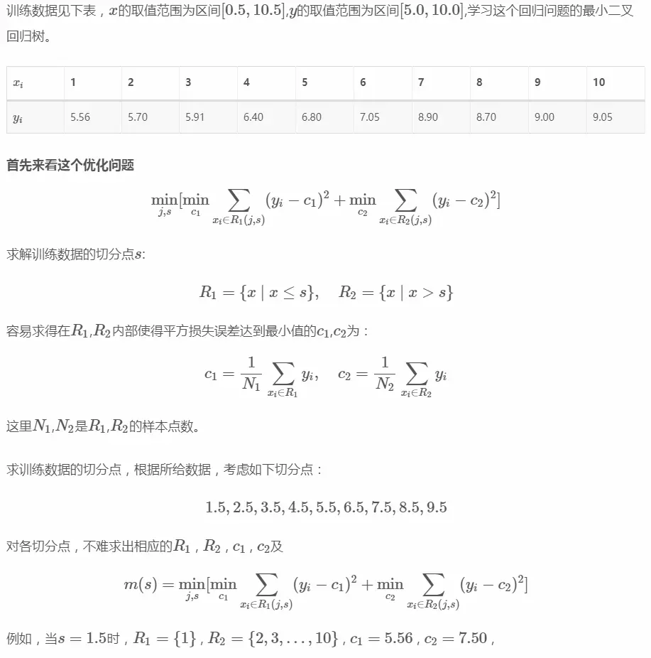 这个算法比前面的那些算法要更加复杂一点,有很多公式。要想理解这个算法的作用,我们得先从感性上理解这个算法是做什么的。 我们考虑最简单的最小二乘回归,CART要求我们将所有输入数据都当作在二维的平面上若干个数据点。以x轴为划分依据(也就是最后的回归树的分界线是x的值,x大于或小于某个值会判断成什么)。