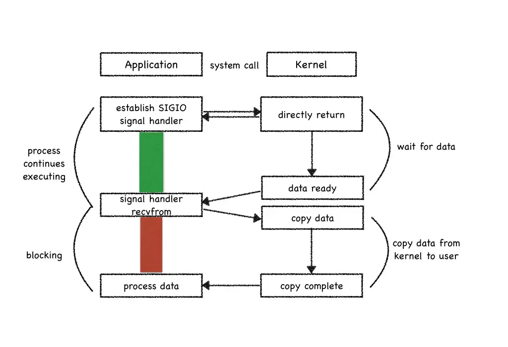 In this model, application process system call sigaction and install a signal handler, the kernel will return immediately and the application process can do other works without being blocked. When the data is ready to be read, the SIGIO signal is