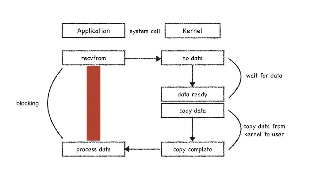 Operating System’s I/O Models can be divided into five categories: Blocking I/O, Non-blocking I/O, I/O Multiplexing, Signal-driven I/O and Asynchronous I/O. I will take Network I/O case for example, though there still have File I/O and other types, such as DNS relative and user code in Node. Take Network scenario as an example is just for convenience.