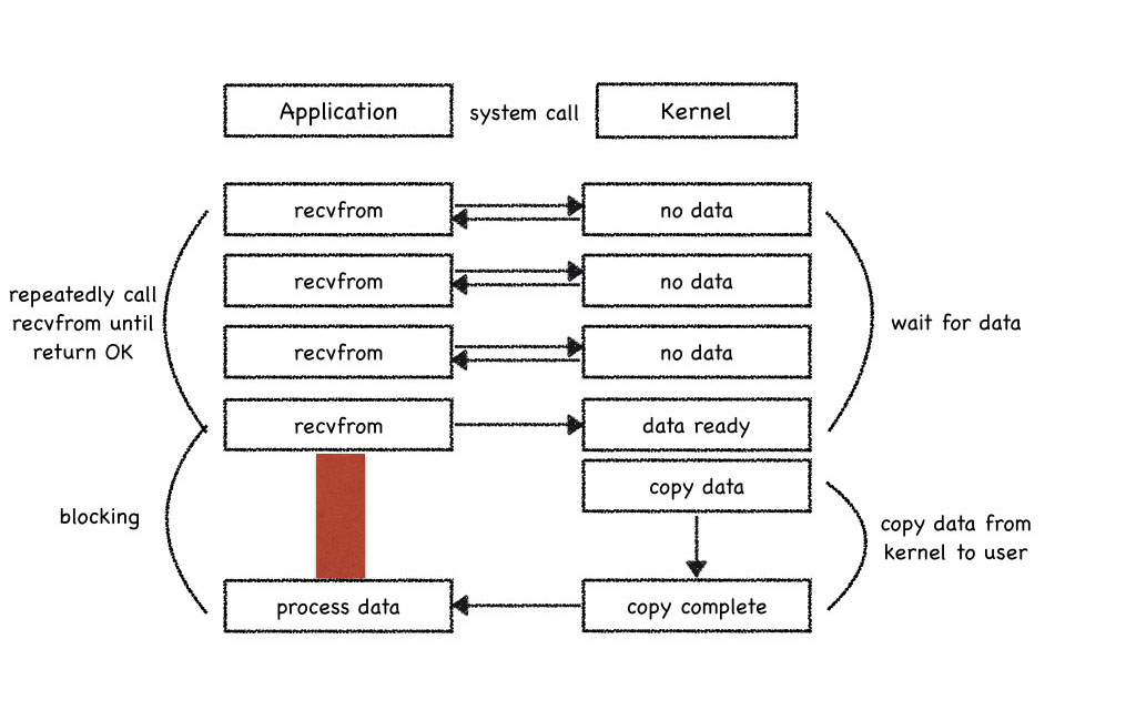 Non-Blocking I/O, AKA busy looping, it can deal with multiple streams. The application process repeatedly call system to get the status of data, once any stream’s data becomes ready, the application process block for data copy and then deal with the data available. But it has a big disadvantage for wasting CPU time. Its flows diagram sdemonstrated below: