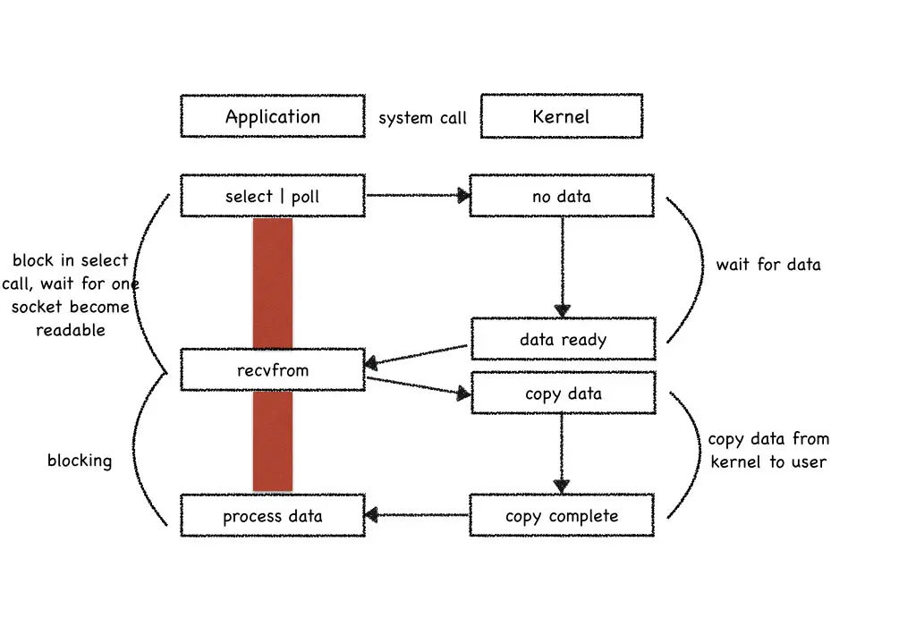 Select and poll are based on this type, see more about select and poll. I/O Multiplexing retains the advantage of Non-Blocking I/O, it can also deal with multiple streams, but it’s also one of the blocking types. Call select (or poll) will block application process until any stream becomes ready. And even worse, it introduce another system call (recvfrom).
