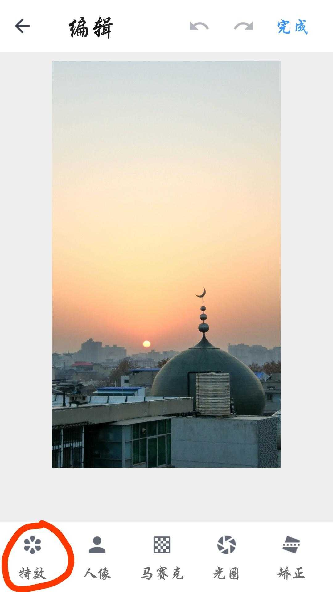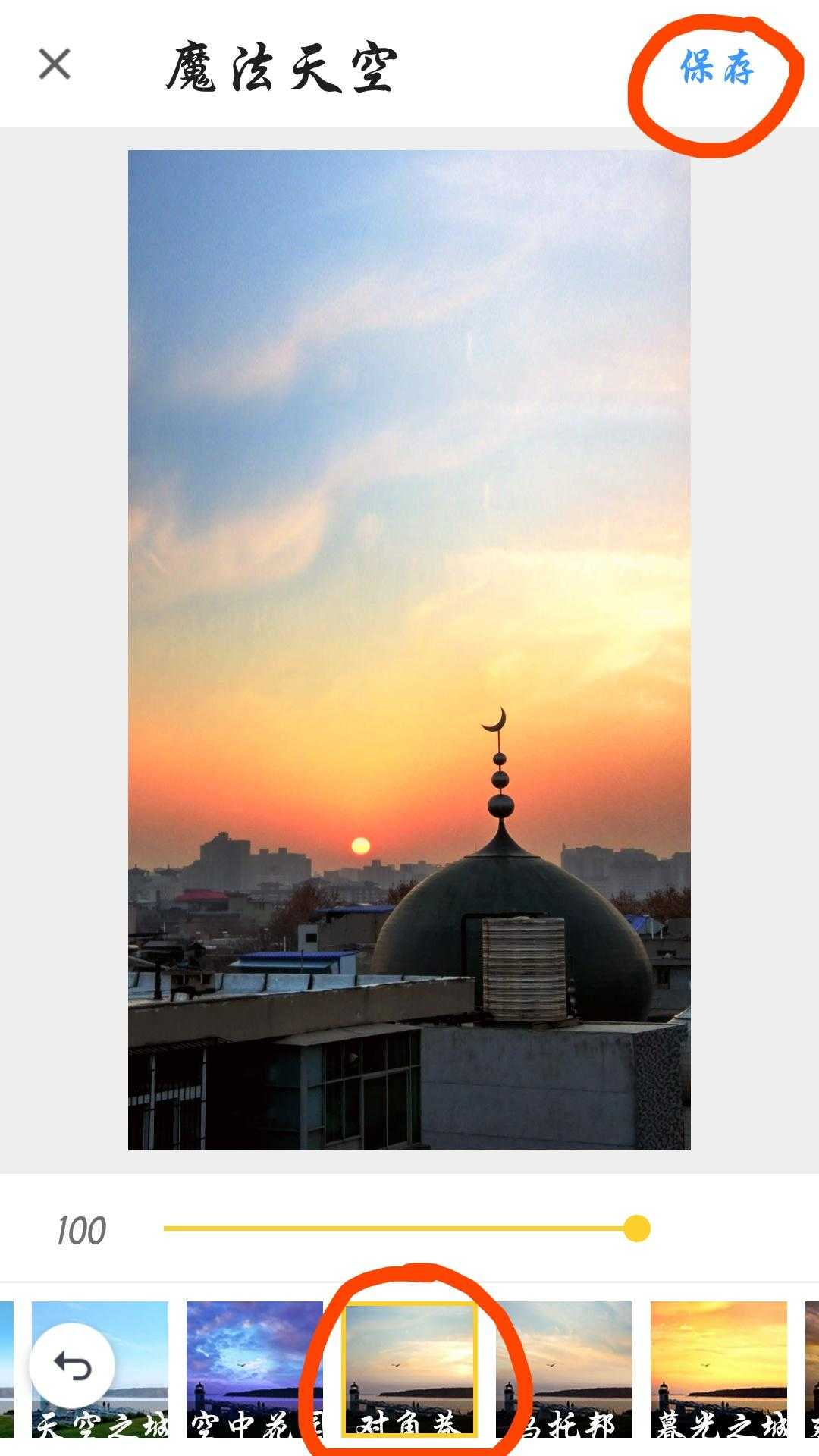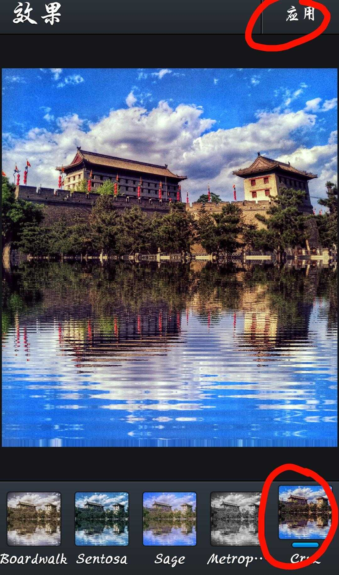 最后选择一款复古的滤镜,这种古城的沧桑感和水天的通透感对比出来了,点击应用,