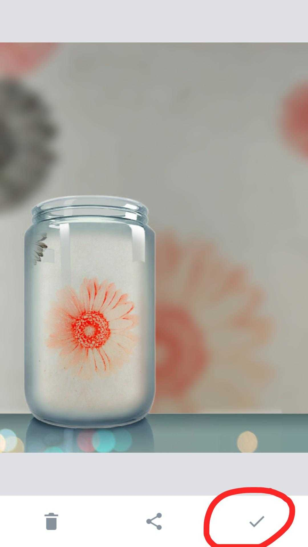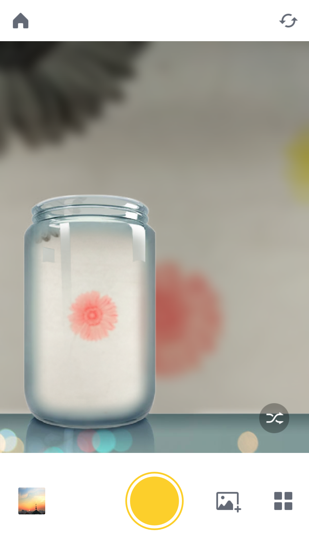 场景模版至少有15种,且不断更新中,可以满足你不同场景的幻想,这时先点击下面最右边选择一个自己喜欢的场景,我这里选择了一个瓶子作为场景,点击下面拍照将桌子上的花拍了进去,这时可以看到那朵小红花作为了主体被突出放在了瓶子里,而红花周围的花朵作为背景被虚化了,这里也可以点击下面相册按钮选择相册里的照片作为瓶子里的画面,