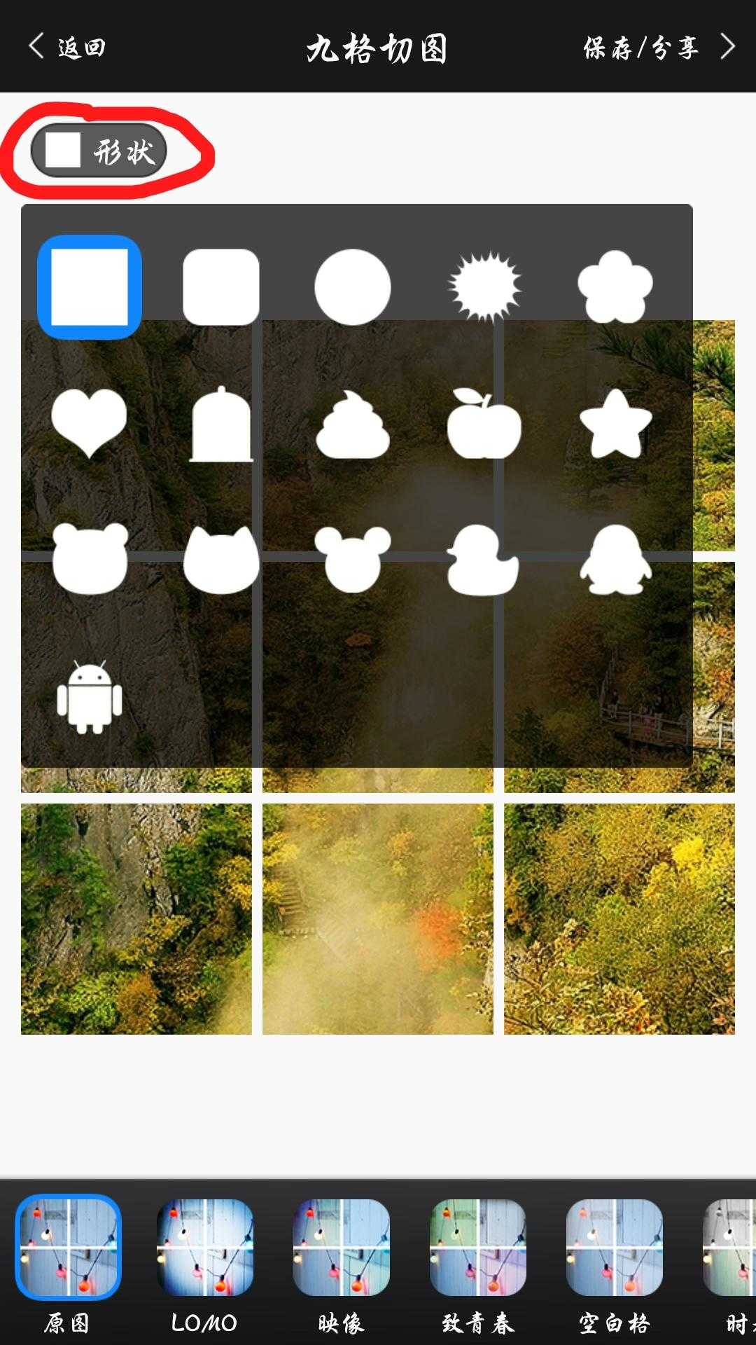 打开相册照片,可以看到软件自动将照片分割成九个部分。切割形状可以选择圆形的。方形的,甚至动物头像形状的等,最下面还可以选择一个自己喜欢的滤镜,