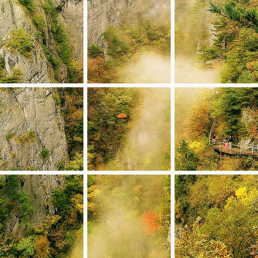 下面是保存在相册里被切成九块的图片和最终效果图,按照下面提示顺序将照片依次放在朋友圈,就会拼接成一张完整的九格切图,然后分享出去,就可以完美的完成装X了。