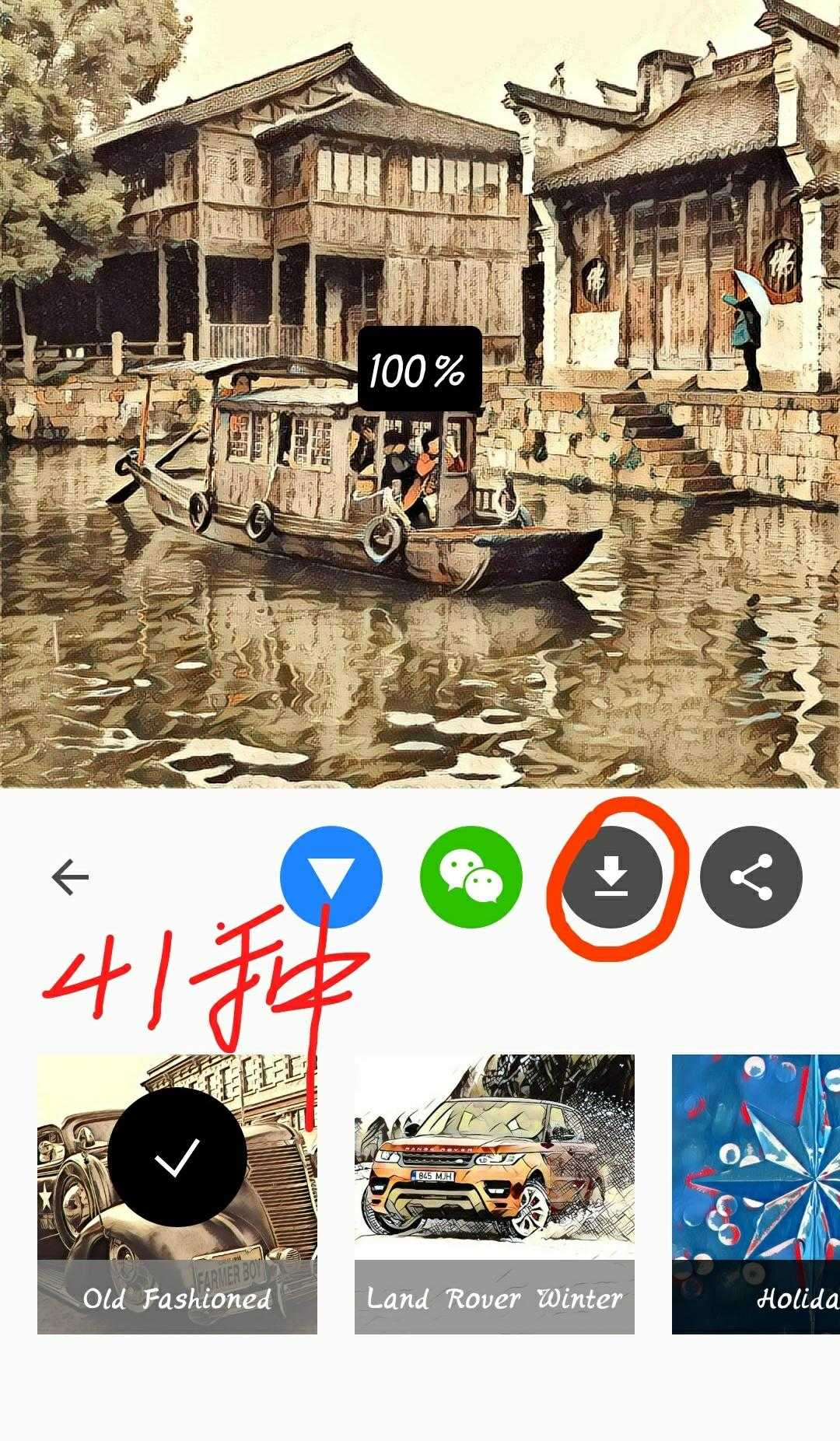 该款软件有41种风格的艺术滤镜,这里的照片是我在乌镇拍的,当时一搜小船正好路过,就顺手抓拍了下来,实则幸运,恰好运用上了三分法构图,所以这里选择第一种古典风格,手指左右滑动,最后将滤镜成都设置成100%,更适合复古,古色古香的的艺术风格,